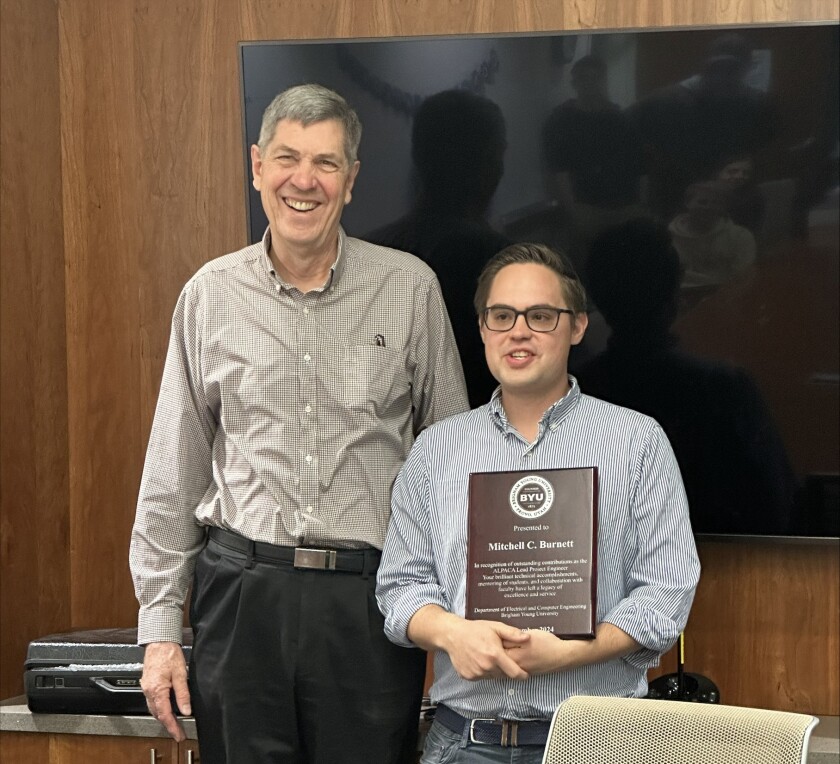 As his time at BYU comes to a close, Mitchell Burnett has been recognized for his work as ALPACA Lead Project Engineer. He has made a difference with instrumental technical accomplishments, student mentorship, and excellent collaboration with the faculty of the Department of Electrical and Computer Engineering. Burnett has devoted 6 years of diligent efforts to BYU as a full-time research faculty member and has made an incredible impact on the department.